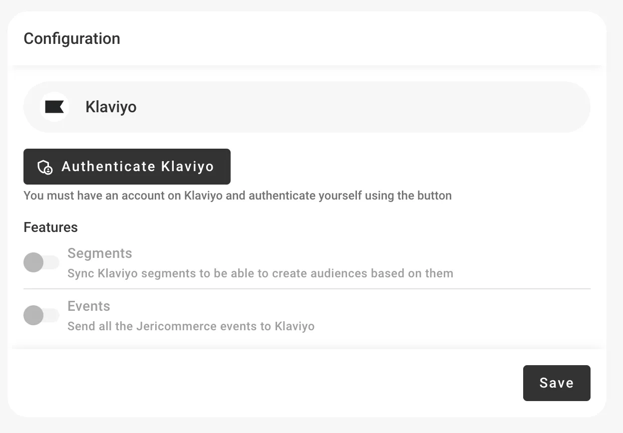 - After completing the access to your Klaviyo account, you will be able to activate two features: Events and Segments.