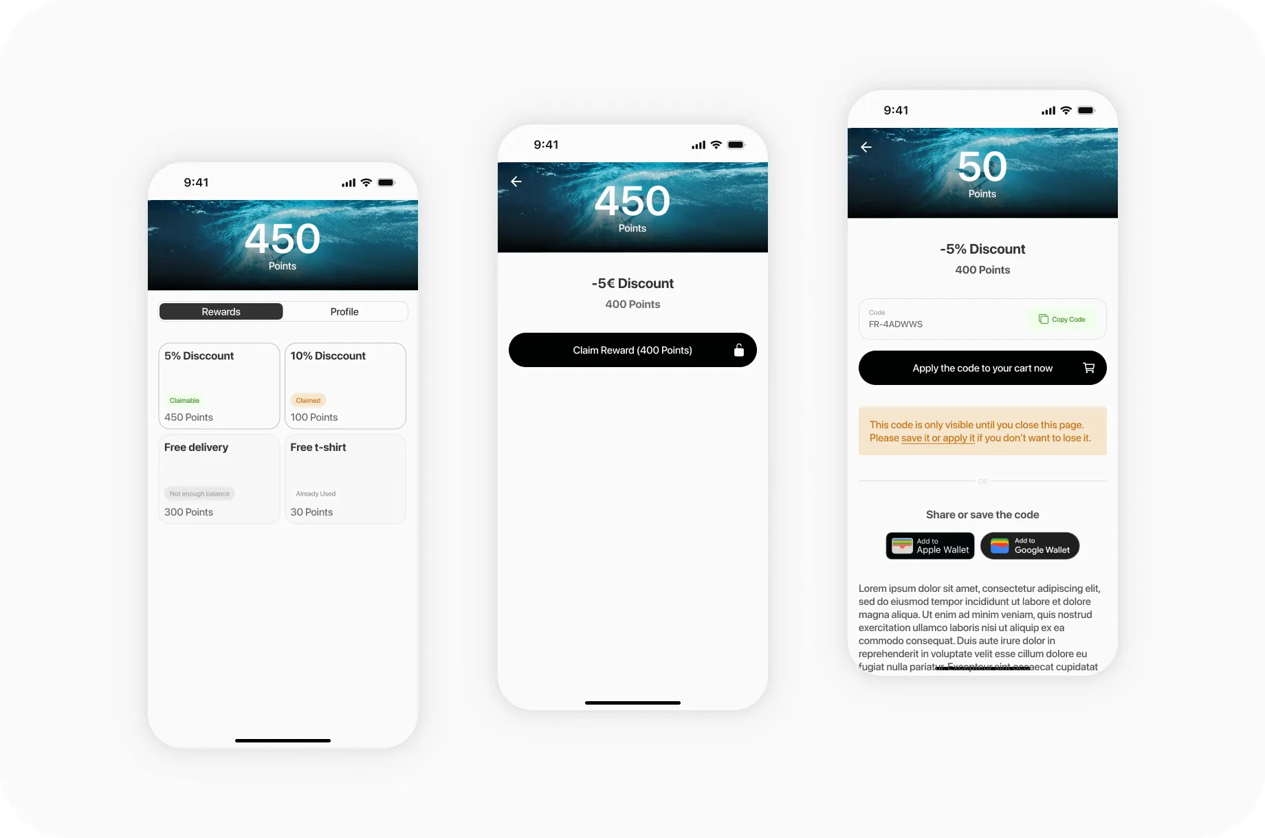 They can claim these rewards and apply them directly in your online store or save them as coupons in their wallets, ready to be scanned at your physical store.