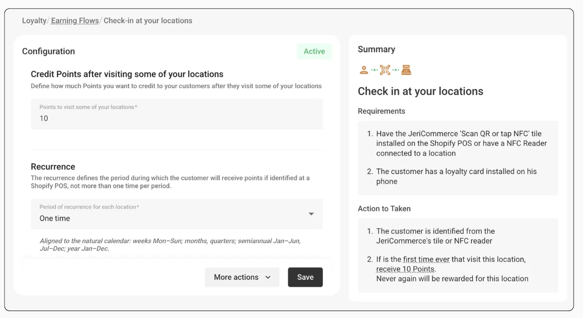 A strong loyalty program connects both online and offline interactions. With the “Check-in at your locations” earning flow, you can credit points to your customers when they visit one of your physical stores.