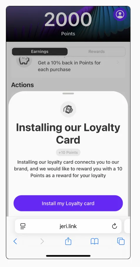 This flow is only valid if enabled before the customer has installed the loyalty card. If you enable the earning flow from the JeriCommerce Admin, customers who have the loyalty card already installed will not see the earning flow completed.