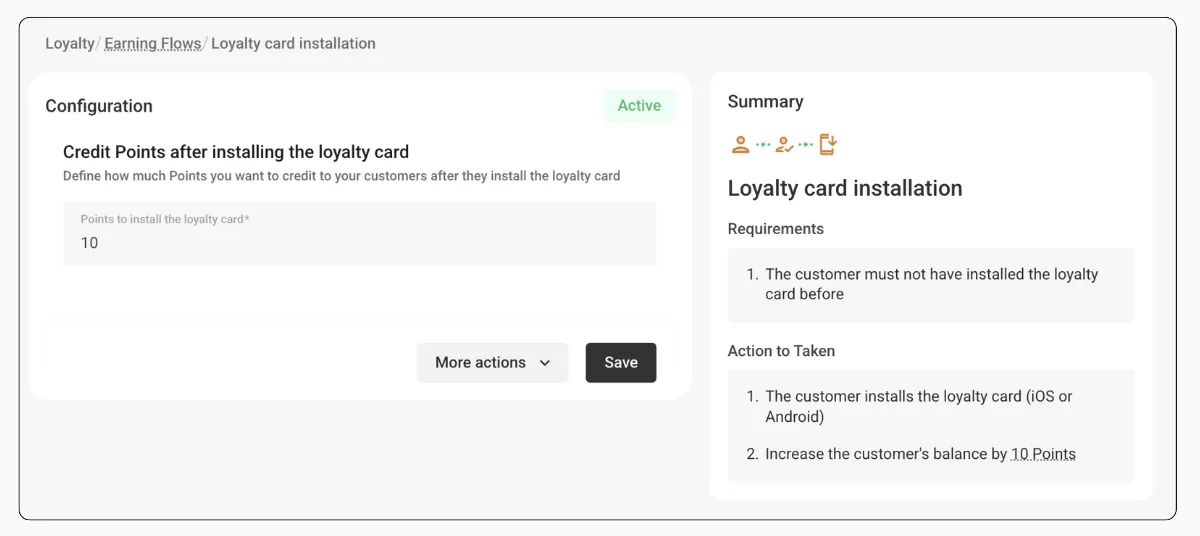 Encouraging customers to install your loyalty card is the first step toward creating regular engagement. With the “Credit Points after installing the loyalty card” earning flow, you can automatically reward customers the first time they add your loyalty card to their Apple Wallet or Google Wallet.