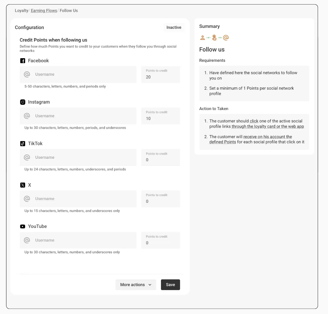 Building a loyalty program isn’t only about rewarding purchases—it’s also about creating stronger relationships with your customers. With the “Credit Points when following us” earning flow, you can reward customers who follow your brand on social networks like Facebook, Instagram, TikTok, X (Twitter), or YouTube.