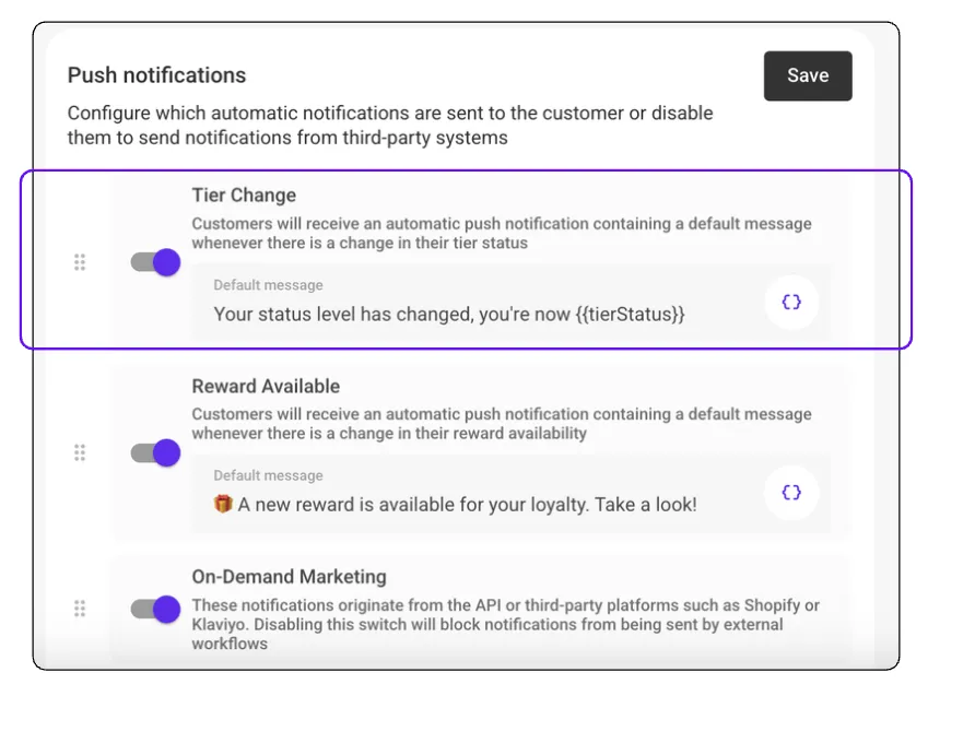 The default message is: "Your status level has changed, you're now {{tierStatus}}".