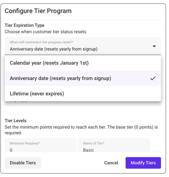 - Enrollment-Based: The recalculation occurs one year from when the customer joined your program.