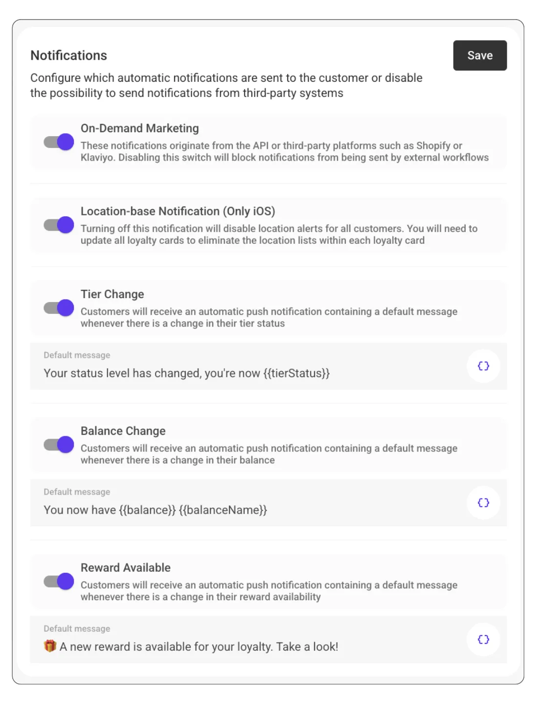 You can manage the automatic notifications from the admin site by navigating to Settings > Customer Flows > Notifications. There, you can customize the messages for your program, using variables to personalize them as much as possible, aligning with your brand's tone. There, you can deactivate the tier and balance updates for your program and communicate these updates from third-party systems like Shopify Flows, Klaviyo Flow, or directly from the API.