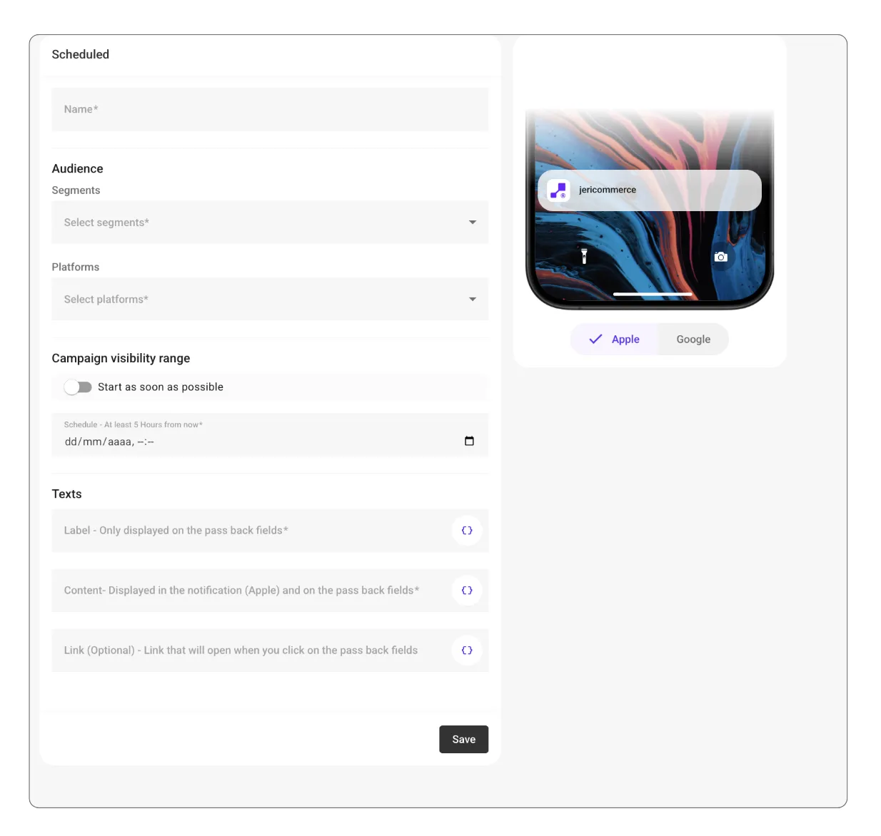 - Content: Appears in the notification (Apple) and on the pass back fields.