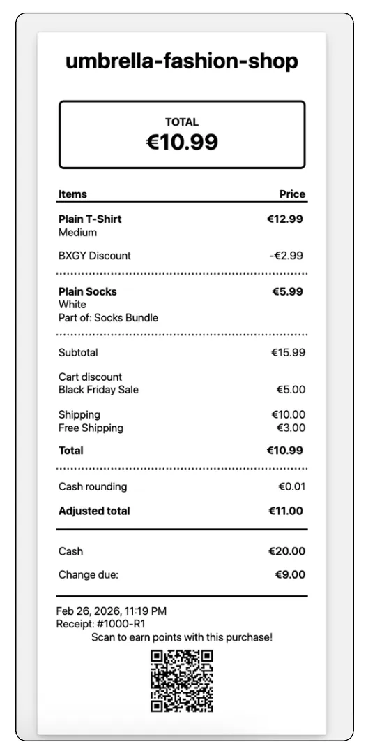 The Receipt QR Code extension prints a scannable QR code on your Shopify POS receipts. When a new customer scans it, they can sign up for your loyalty program and automatically receive points for that in-store purchase — no manual action needed from your staff.