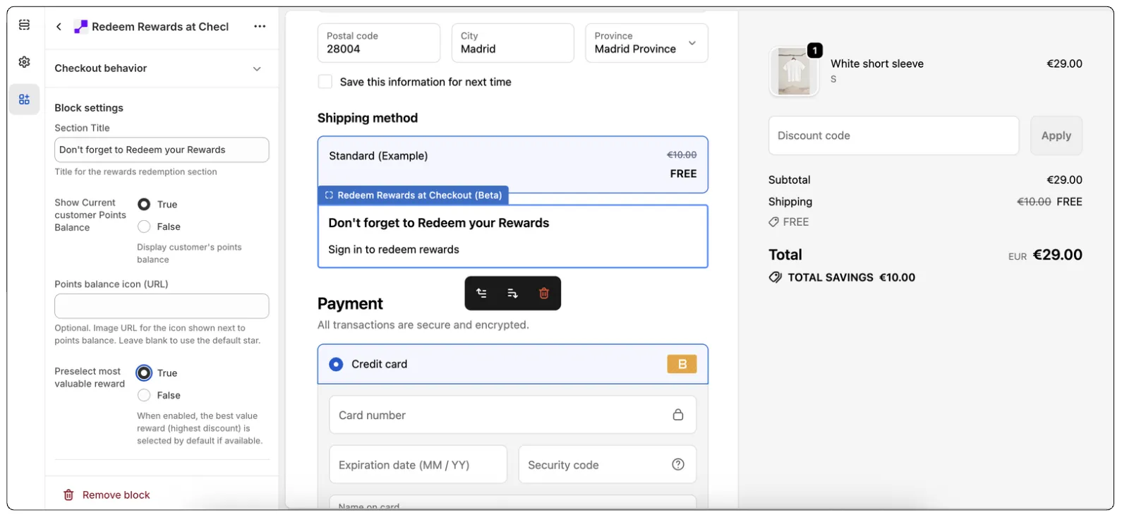 - Theme Editor Control: Retailers can manage the block's placement and behavior directly within the Shopify Checkout Editor.