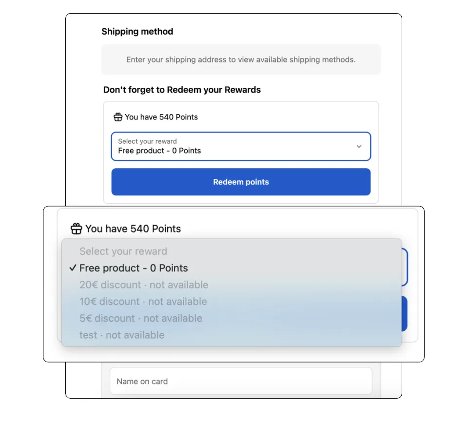 - Reward Dropdown: Allows customers to select from a list of available rewards, such as specific discount amounts or free products, based on their eligible points.