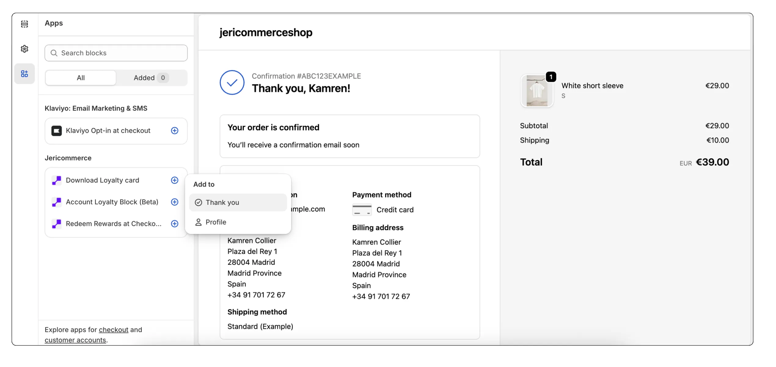 - Customer Profile: Can be added as a block within the customer account section.This native approach allows you to drag and drop the extensions to the exact vertical position you prefer using the standard Shopify Theme Editor.