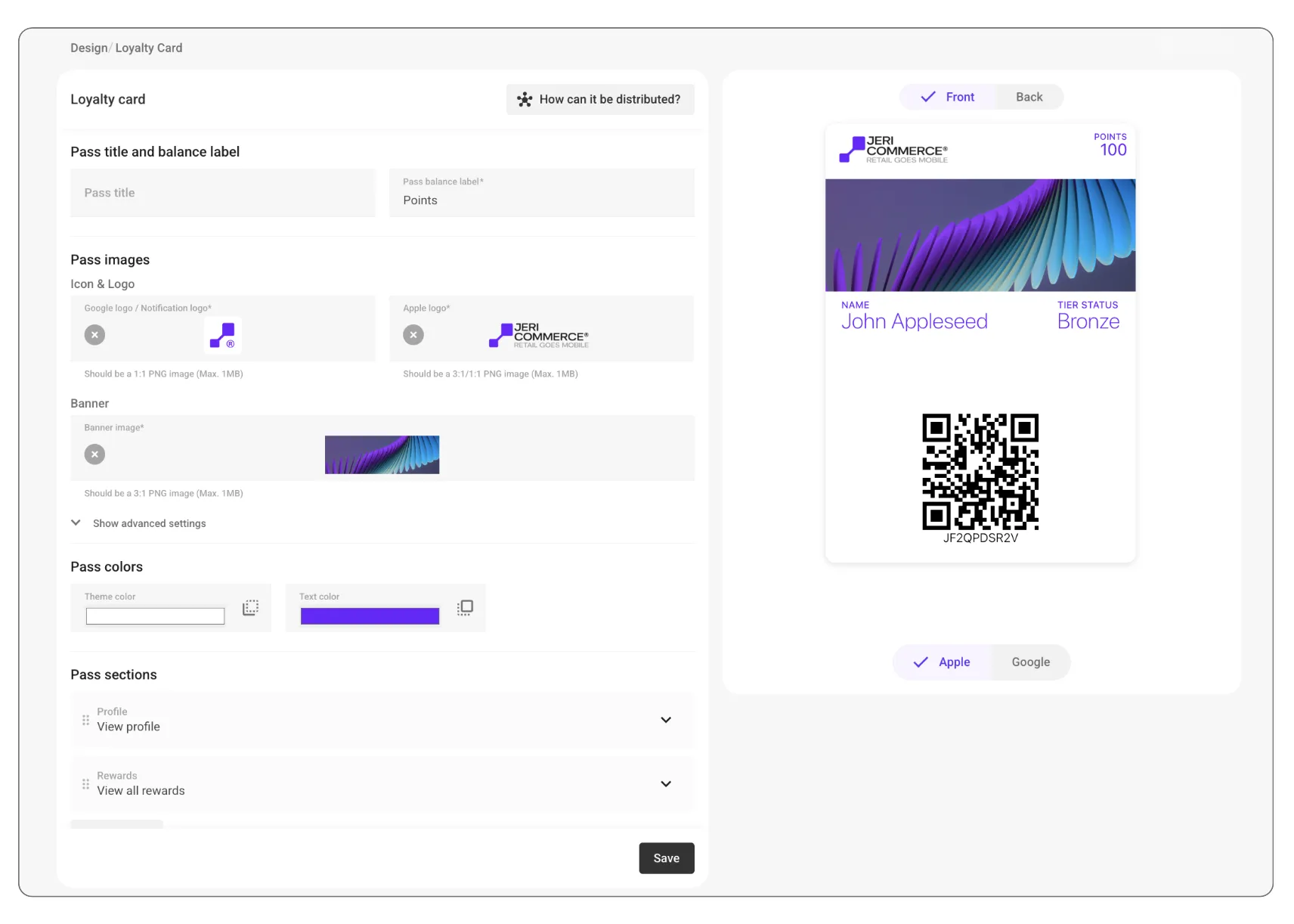 To build the best wallet aligned with your brand, you must design the appropriate assets. Consider how they will be displayed on each platform or location. In the Design section of the side menu, you can select the wallet tab to preview your wallet and update its design.